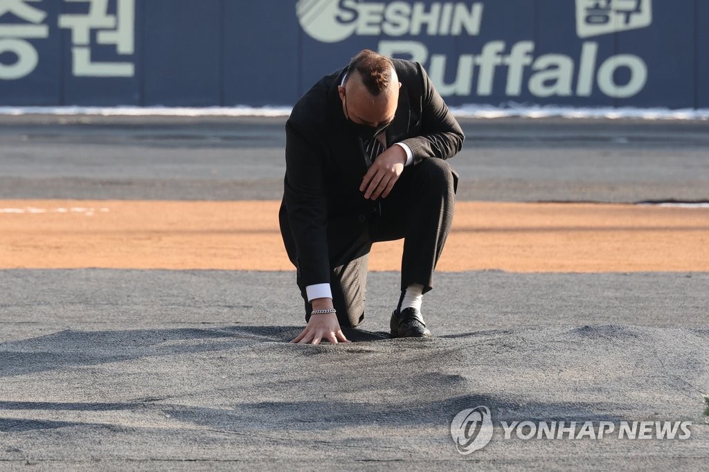 | ▲  Former Doosan Bears pitcher Yoo Hee-kwan touches the mound at Jamsil Baseball Stadium in Seoul after his retirement press conference at the ballpark on Jan. 20, 2022. (Yonhap) |
