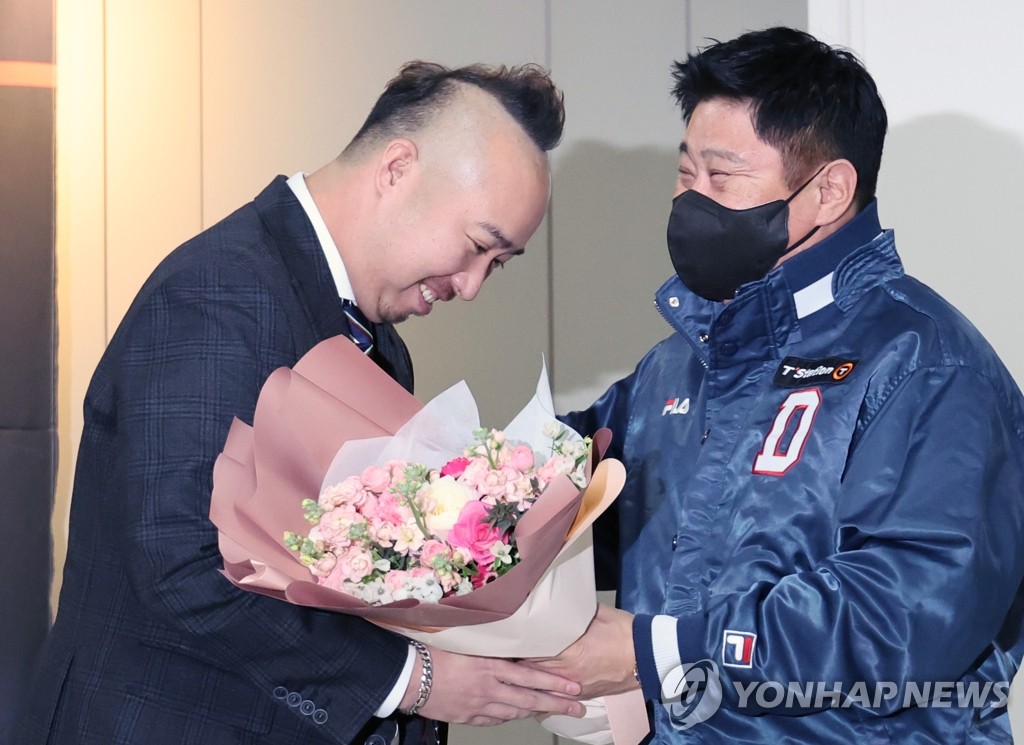 | ▲  Former Doosan Bears pitcher Yoo Hee-kwan (L) receives a bouquet of flowers from the team's manager, Kim Tae-hyoung, before his retirement press conference at Jamsil Baseball Stadium in Seoul on Jan. 20, 2022. (Yonhap) |