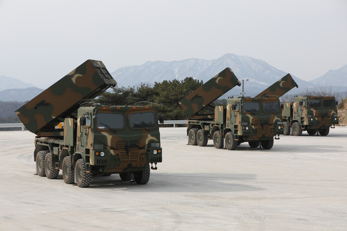 South Korea-made multiple rocket launcher K-239 Cheonmu is ready to fire during the 6th Corps' winter drill in Cheorwon, about 90 kilometers northeast of Seoul, on Feb. 28, 2024. (Yonhap)