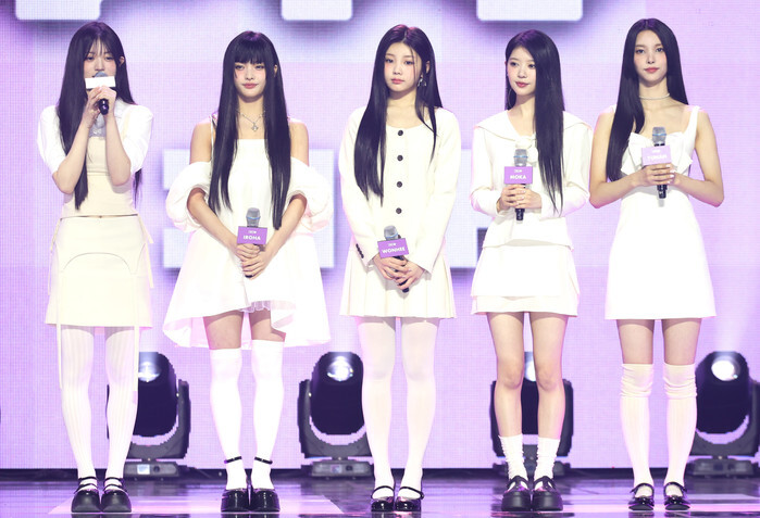 South Korean girl group ILLIT poses for a photo during a showcase for the group's debut mini album "Super Real Me" with title song "Magnetic" in Seoul on March 25, 2024. (Yonhap)