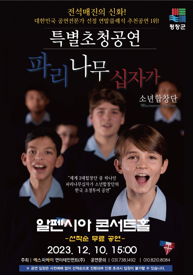 (평창=연합뉴스) 이재현 기자 = 세계 3대 합창단 중 하나인 파리나무십자가소년합창단 특별초청공연이 오는 10일 오후 3시 평창군 알펜시아 콘서트홀에서 열린다.