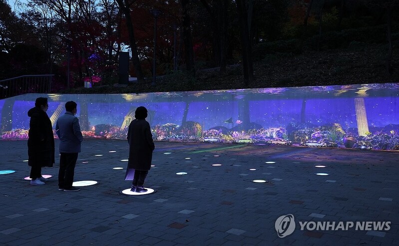 | ▲ 사직 빛의 숲에서 미디어아트 관람 (광주=연합뉴스) 조남수 기자 = '사직 빛의 숲' 점등 행사가 열린 29일 오후 광주 남구 사직공원에서 시민들이 미디어아트를 관람하고 있다. 광주시는 유네스코 미디어아트 창의 도시로서 위상을 높이고 시민이 일상 공간에서 미디어아트를 경험할 수 있도록 2019년부터 창의 벨트 조성사업을 추진하고 있다. 미디어아트 창의 벨트 3권역 '사직 빛의 숲'은 남구 사직공원 내 산책로 830m 구간에 조성됐다. 2023.11.29 iso64@yna.co.kr |