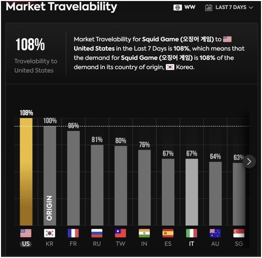 한국에서의 수요를 100으로 봤을 때 미국이 8%포인트 높다는 뜻이다. 프랑스(95%). 러시아(81%), 타이완(80%) 등에서도 높은 확산성을 보였다.