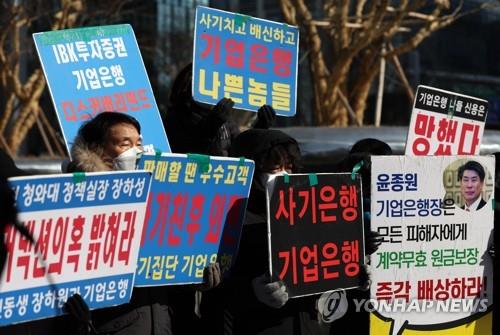 | ▲ Members of an association of fund fraud victims stage a protest protest in front of Industrial Bank of Korea headquarters in Seoul, calling for full explanations and compensation over the mis-selling of "Discovery funds," on Feb. 16, 2022. (Yonhap) |
