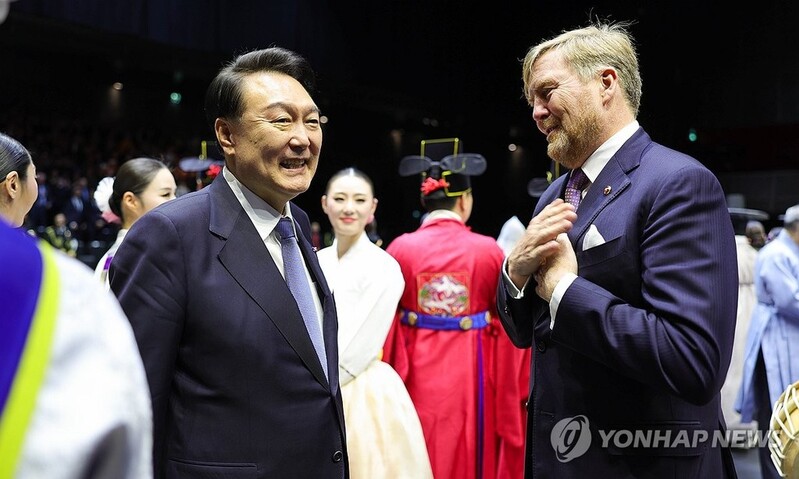 | ▲ 대화하는 윤석열 대통령과 네덜란드 국왕 (암스테르담=연합뉴스) 임헌정 기자 = 네덜란드를 국빈 방문한 윤석열 대통령과 빌럼-알렉산더르 네덜란드 국왕이 13일(현지시간) 암스테르담 시내 공연장에서 열린 답례 문화 공연에서 대화하고 있다. 2023.12.14 [공동취재] kane@yna.co.kr |