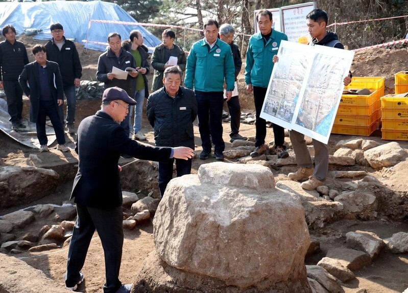 | ▲ 태일전 발굴현장 둘러보는 가세로 태안군수(가운데) [태안군 제공. 재판매 및 DB 금지] |