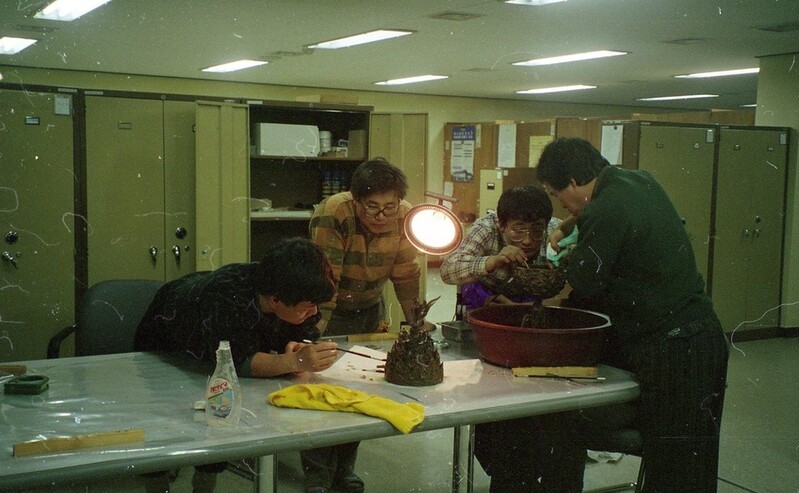 | ▲ 향로 발굴 직후 이물질을 닦으며 보존처리하는 모습 [국립부여박물관 제공. 재판매 및 DB 금지] |