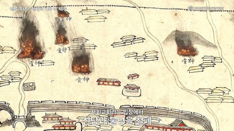 하지만 이보다 더 눈길을 끄는 건 한라산 중턱과 제주읍성 밖 마을에서 검은 연기를 내뿜으며 신당이 불타는 장면이다.