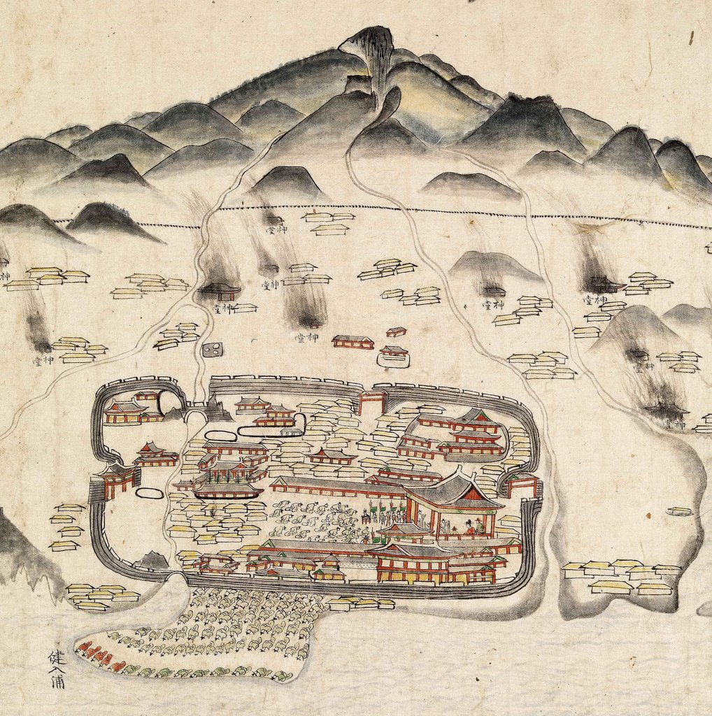 | ▲ 조선시대 탐라순력도 '건포배은' 일부분 (제주=연합뉴스) 조선 숙종 1702년 제주 목사로 부임한 이형상이 화공 김남길에게 남기도록 한 채색 화첩 '탐라순력도' 건포배은의 일부분을 확대한 그림. 한라산 중턱과 제주성 밖 민가 사이에 신당들이 검은 연기를 내뿜으며 불타는 모습이 묘사돼 있다. 2022.1.23 [제주도 제공, 재판매 및 DB 금지] |