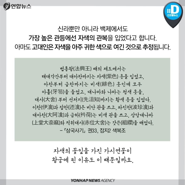 신라뿐만 아니라 백제에서도 가장 높은 관등에선 자색의 관복을 입었다고 합니다.