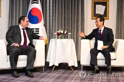 | ▲ South Korean Prime Minister Han Duck-soo (R) talks with Dimitri Kerkentzes, secretary general of the Bureau International des Expositions (BIE), in Paris on June 22, 2022, in this file photo provided by Han's office. Han attended a BIE general assembly to make a presentation on South Korea's bid to host the 2030 World Expo in its largest port city of Busan. (PHOTO NOT FOR SALE) (Yonhap) |