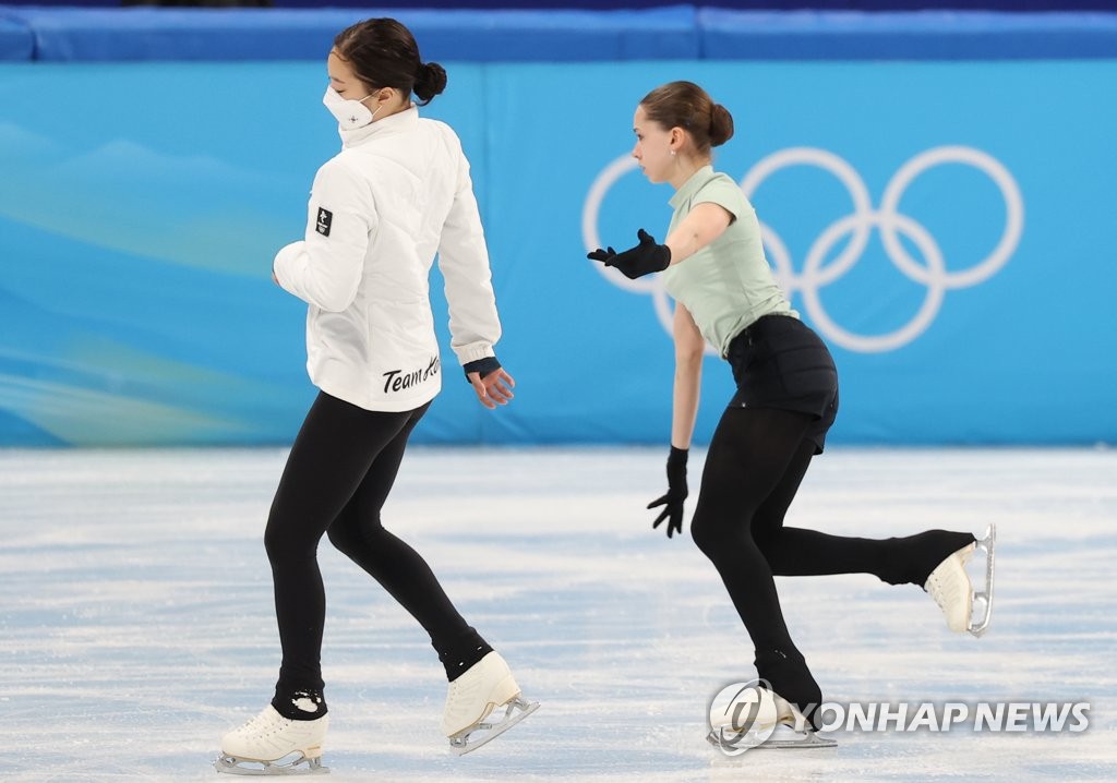 | ▲  South Korean figure skater You Young (L) trains next to Kamila Valieva of the Russian Olympic Committee at Capital Indoor Stadium in Beijing on Feb. 16, 2022, the eve of the free skate in the women's singles competition at the Beijing Winter Olympics. (Yonhap) |