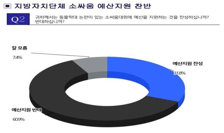 지방자치단체의 소싸움 예산 지원에 대해서는 반대 60.9%, 찬성 31.8%로 부정적인 의견이 역시 더 높았다. 잘 모름은 7.4%였다.