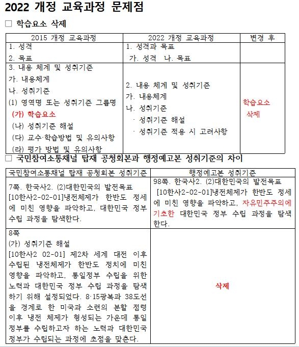 아울러 행정예고본에는 성취기준 '대한민국의 발전목표'에 '냉전체제가 한반도 정세에 미친 영향을 파악하고, 자유민주주의에 기초한 대한민국 정부 수립 과정을 탐색한다'라고 서술됐다.