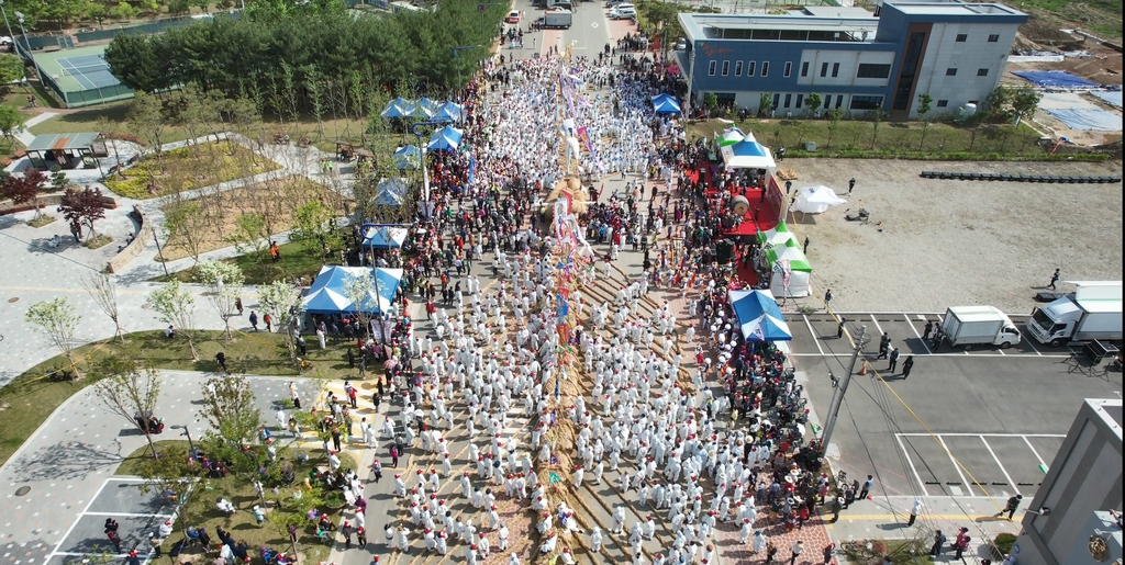 (의령=연합뉴스) 김동민 기자 = 21일 경남 의령군 의령문화원 앞에서 '의령큰줄땡기기' 대회가 열리고 있다.