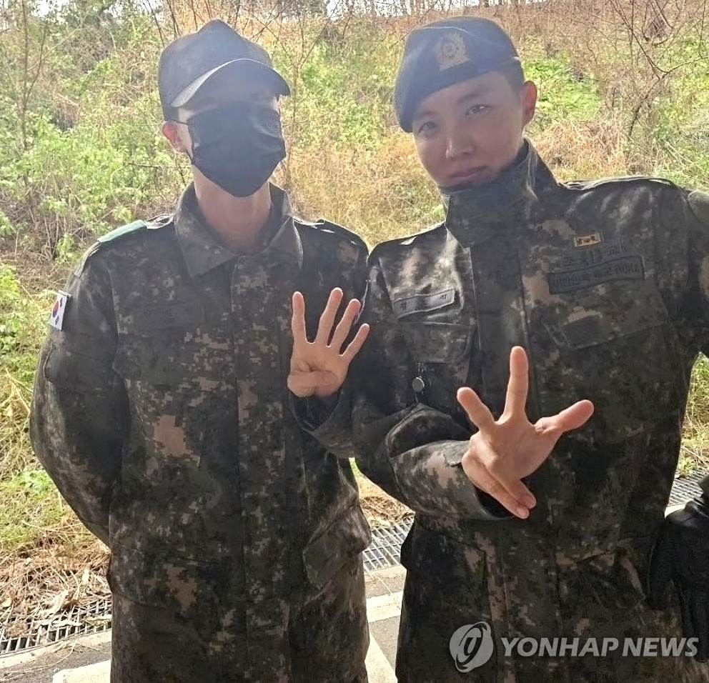 | ▲ 군 복무 중인 방탄소년단 진(좌)과 제이홉(우) (서울=연합뉴스) 11일 논산훈련소에서 그룹 방탄소년단(BTS)의 RM과 뷔의 입대를 배웅하기 위해 휴가를 나온 진(왼쪽)과 제이홉. 2023.12.11 [방탄소년단 진 인스타그램. 재판매 및 DB 금지] photo@yna.co.kr |