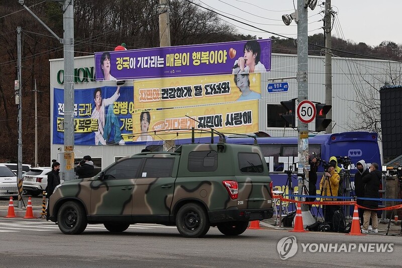 | ▲ 동반입대하는 BTS 지민·정국 (연천=연합뉴스) 임병식 기자 = 12일 오후 경기도 연천군 육군 5사단 신병교육대대에서 그룹 방탄소년단(BTS)의 지민과 정국 일행이 탄 차량이 훈련소 안으로 이동하고 있다. 2023.12.12 andphotodo@yna.co.kr |