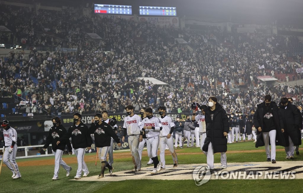 | ▲ Members of the LG Twins walk off the field at Jamsil Baseball Stadium in Seoul after losing to the Doosan Bears 5-1 in Game 1 of the first round in the Korea Baseball Organization postseason at Jamsil Baseball Stadium in Seoul on Nov. 4, 2021. (Yonhap) |
