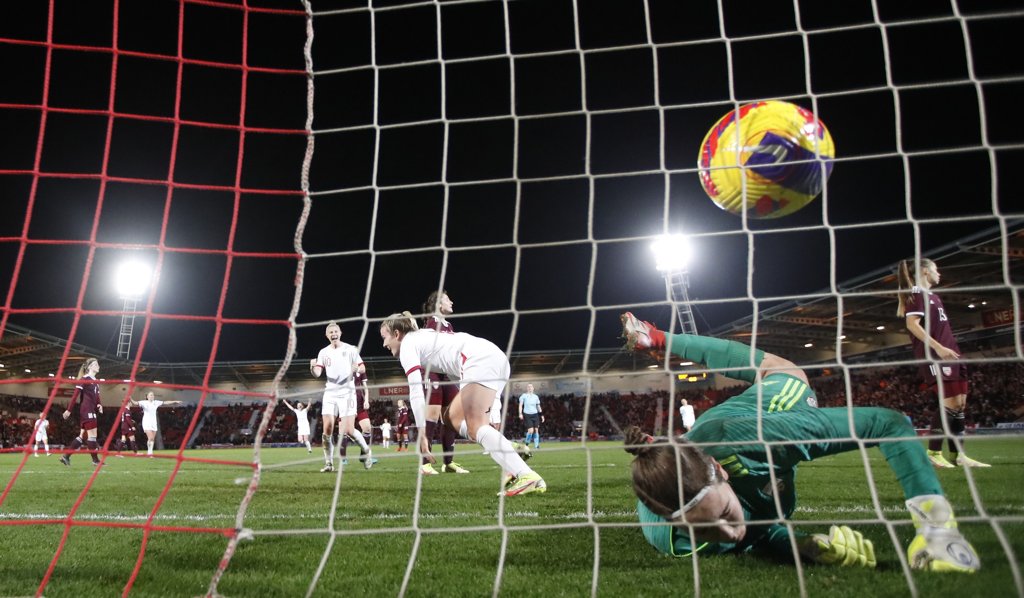 ▲ 잉글랜드와 라트비아의 여자축구 월드컵 지역 예선 (동커스터[영국] 로이터/액션이미지=연합뉴스) 1일(한국시간) 영국 동커스터에서 열린 잉글랜드와 라트비아의 여자축구 월드컵 지역예선전에서 잉글랜드가 골을 넣고 있다. 2021.12.1