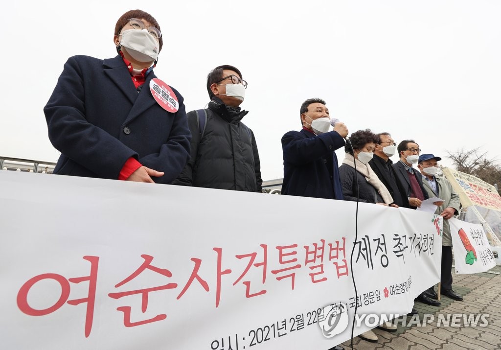 | ▲ 여순사건특별법 제정 촉구 기자회견 (서울=연합뉴스) 류영석 기자 = 22일 오전 서울 여의도 국회 앞에서 여순항쟁서울유족회 관계자 등이 여순사건특별법 제정 촉구 기자회견을 하고 있다. 2021.2.22 ondol@yna.co.kr |