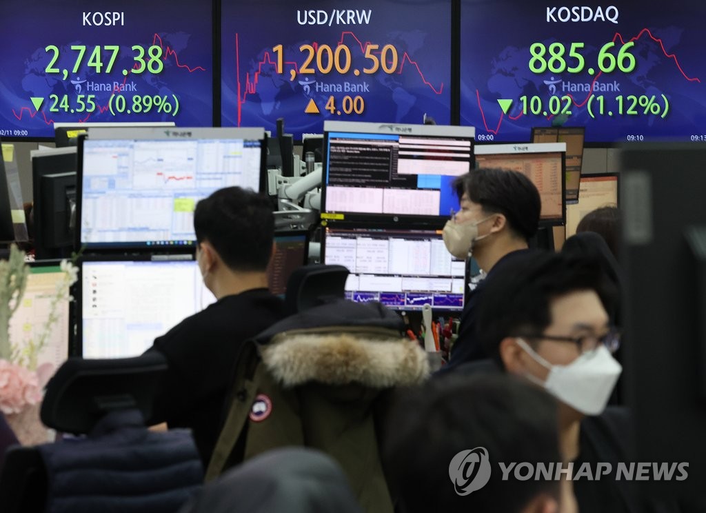 | ▲ Electronic signboards at a Hana Bank dealing room in Seoul show the benchmark Korea Composite Stock Price Index (KOSPI) opened 1.18 percent lower at 2,739.14 on Feb. 22, 2022. (Yonhap) |