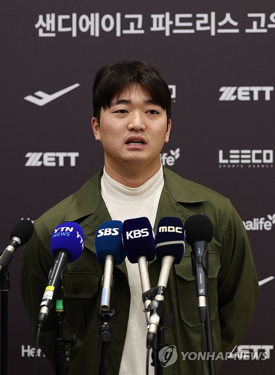 | ▲ MLB 진출 성공 후 귀국한 고우석 (영종도=연합뉴스) 김인철 기자 = 미국프로야구(MLB) 샌디에이고 파드리스와 계약한 투수 고우석이 6일 오전 인천국제공항 제2터미널을 통해 귀국한 뒤 인터뷰를 하고 있다. 2024.1.6 yatoya@yna.co.kr |