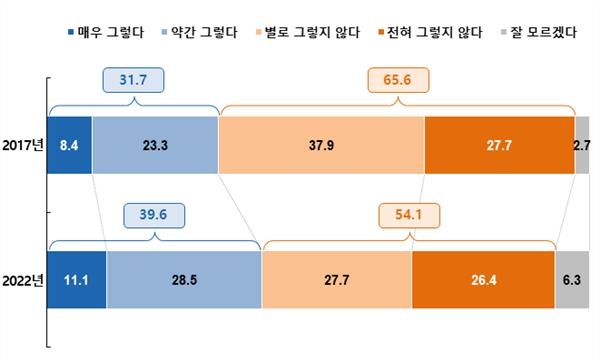 세부 응답별로는 '매우 그렇다' 11.1%', '그렇다' 28.5%였고, '별로 그렇지 않다' 27.7%, '전혀 그렇지 않다' 26.4%로 집계됐습니다.