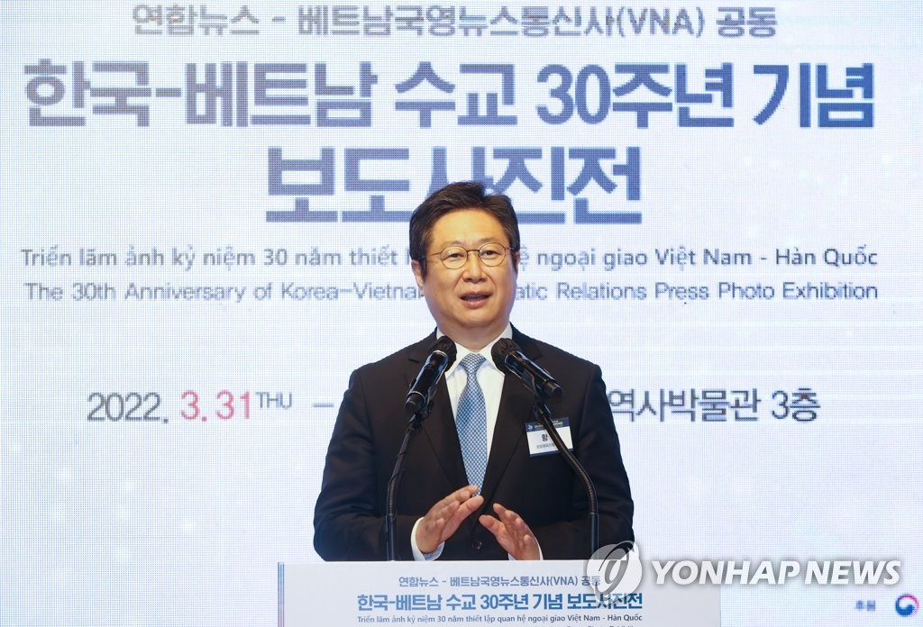 | ▲ 축사하는 황희 문화체육관광부 장관 (서울=연합뉴스) 류효림 기자 = 황희 문화체육관광부 장관이 31일 오후 서울 종로구 대한민국역사박물관에서 연합뉴스 - 베트남국영뉴스통신사(VNA) 공동 주최로 열린 한국-베트남 수교 30주년 기념 보도사진전 개막식에서 축사하고 있다. 2022.3.31 ryousanta@yna.co.kr |