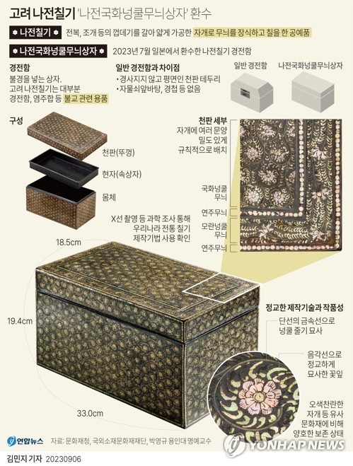 (서울=연합뉴스) 김예나 기자 = 고려시대의 뛰어난 공예 수준을 보여주는 유물이자 그동안 존재가 알려지지 않았던 귀한 나전칠기가 돌아왔다.