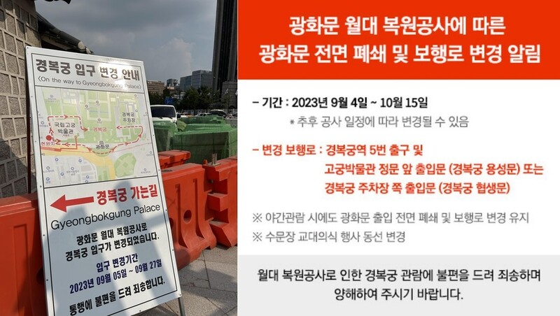 | ▲ 경복궁 입구 변경 안내판 왼쪽은 지난달 서울 종로구 국립고궁박물관 인근에 경복궁 입구 변경을 알리는 안내판이 설치된 모습. 오른쪽은 경복궁 누리집에서 안내하는 광화문 폐쇄 및 보행로 변경 알림 안내. [문화재청 궁능유적본부 제공. 재판매 및 DB 금지] |