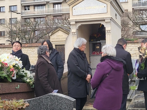 | ▲ 고(故) 윤정희가 안치된 묘지 앞 유족과 지인들 (뱅센<프랑스>=연합뉴스) 현혜란 특파원 = 피아니스트 백건우(77)가 30일(현지시간) 아내 고(故) 윤정희가 안치된 묘지 앞에서 가족, 지인들과 대화를 하고 있다. 2023.1.30 runran@yna.co.kr |