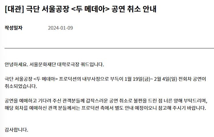 | ▲ 연극 '두 메데아' 공연 취소 공지 [대학로극장 쿼드 홈페이지 캡처. 재판매 및 DB 금지] |