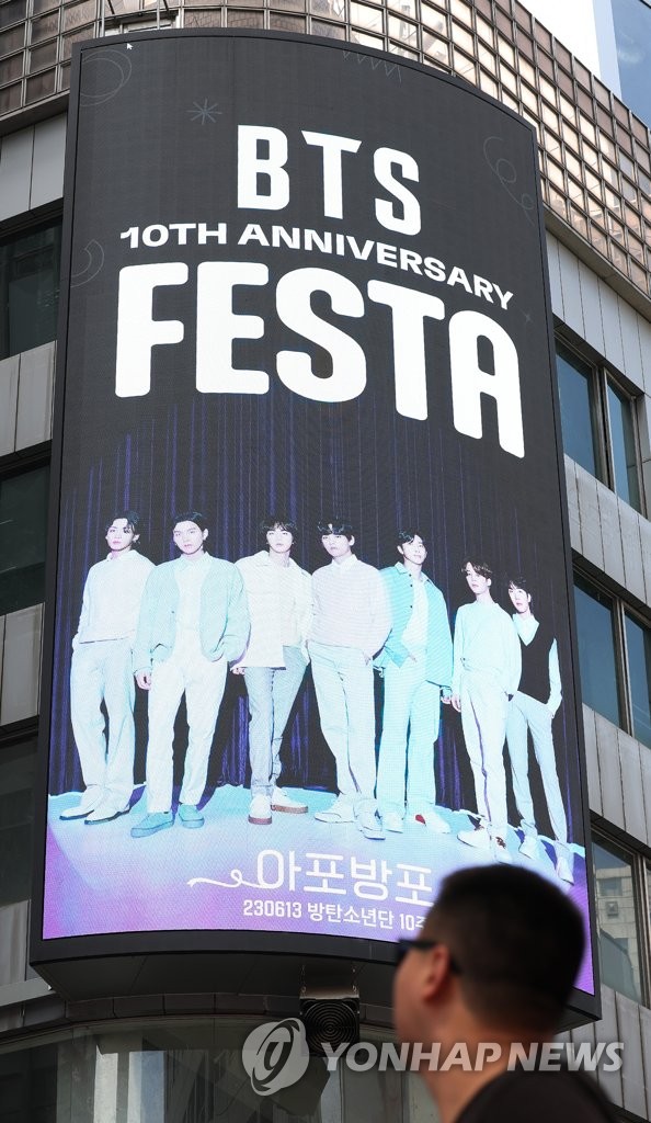 | ▲ An image of K-pop juggernaut BTS is carried on a billboard in Seoul on June 12, 2023, as a two-week-long festival kicked off to celebrate its 10th debut anniversary. (Yonhap) |