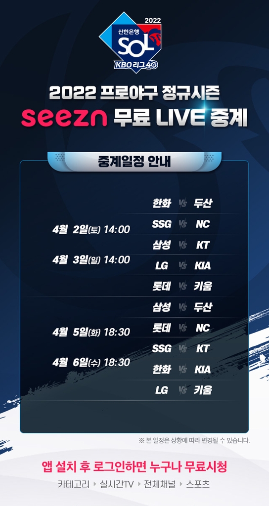 ▲ 프로야구 2022시즌 무료 생중계 = KT 온라인 동영상 서비스(OTT) 플랫폼 시즌이 오는 2일부터 열리는 2022 신한은행 쏠(SOL) KBO리그를 무료로 생중계한다.