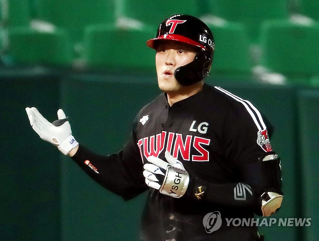 | ▲ In this file photo from Sept. 1, 2020, Yang Suk-hwan of the LG Twins celebrates his three-run home run against the SK Wyverns in the top of the eighth inning of a Korea Baseball Organization regular season game at SK Happy Dream Park in Incheon, 40 kilometers west of Seoul. (Yonhap) |