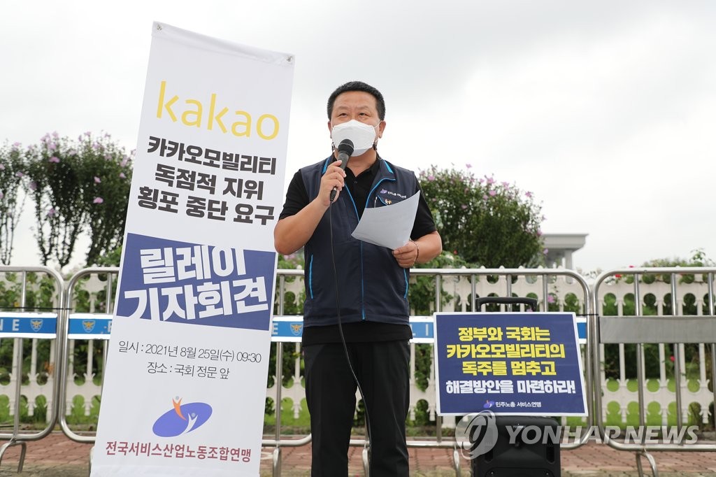 | ▲ 카카오 모빌리티 독점적 지위 횡포 중단 요구 기자회견 (서울=연합뉴스) 류효림 기자 = 강규혁 전국서비스산업노조연맹 위원장이 25일 오전 서울 여의도 국회 앞에서 열린 카카오 모빌리티 독점적 지위 횡포 중단 요구 기자회견에서 발언하고 있다. 2021.8.25 ryousanta@yna.co.kr |