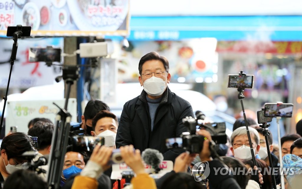 | ▲ Ruling Democratic Party presidential nominee Lee Jae-myung meets with locals at a traditional market in the southeastern city of Pohang on Dec. 13, 2021. (Yonhap) |