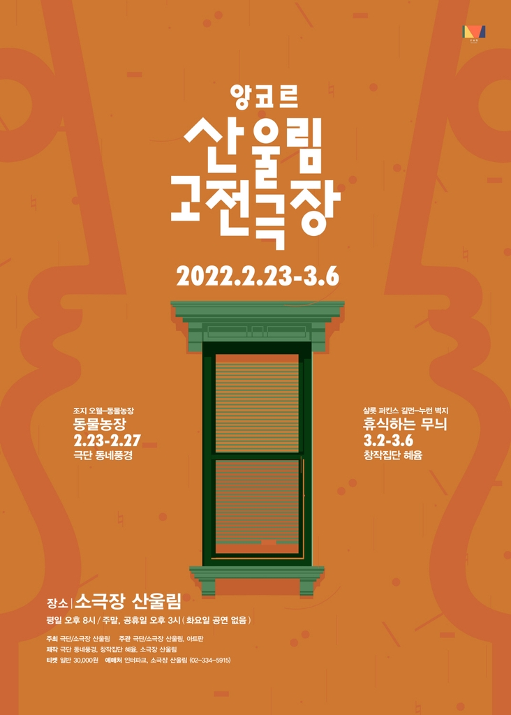 (서울=연합뉴스) 임동근 기자 = ▲ 극단 산울림 '고전극장' 앙코르 공연 = 극단 산울림은 지난해 '산울림 고전극장-우리가 사랑한 영미고전'에서 선보인 다섯 작품 중 '동물농장'과 '휴식하는 무늬'를 다시 무대에 올린다.