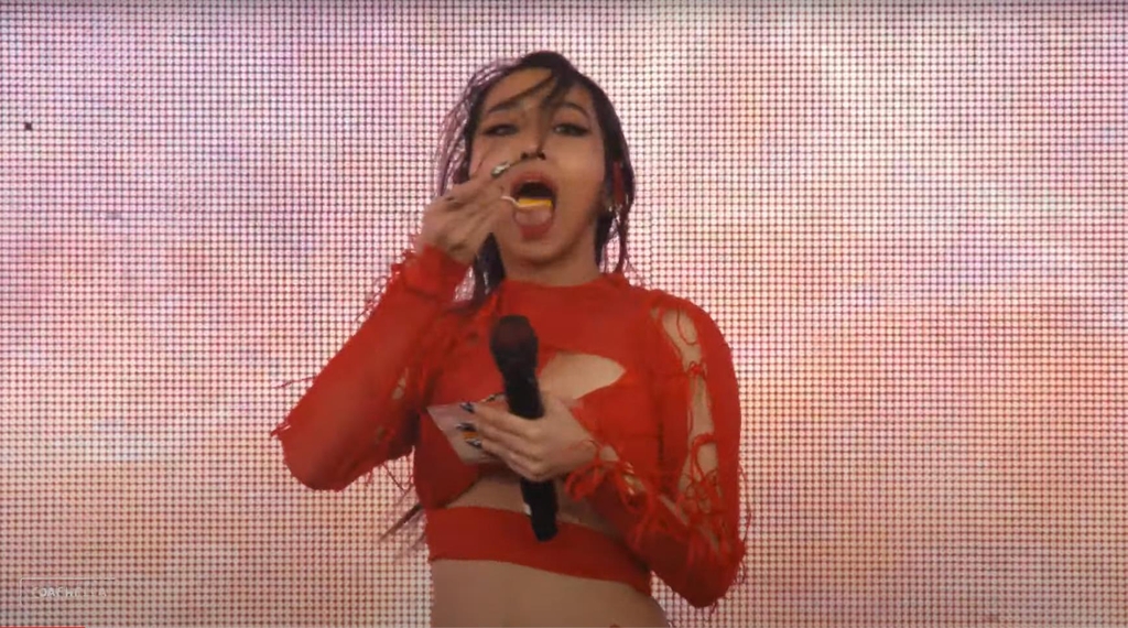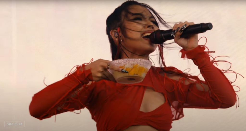 | ▲ 공연 말미에 '망고 스티키 라이스'가 담긴 그릇을 든 래퍼 밀리. [코첼라 유튜브 캡처. 재판매 및 DB 금지] |