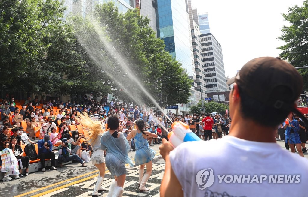 | ▲ '대구 여름 식히는 워터 퍼포먼스' (대구=연합뉴스) 박세진 기자 = 대구의 낮 기온이 33도를 웃돈 10일 오후 대구 동성로 일대에서 열린 파워풀 대구 페스티벌에서 스트릿 댄스팀 아트지(artgee)가 워터 퍼포먼스를 선보이고 있다. 이번 축제는 코로나19로 인해 3년 만에 열렸다. 2022.7.10 psjpsj@yna.co.kr |