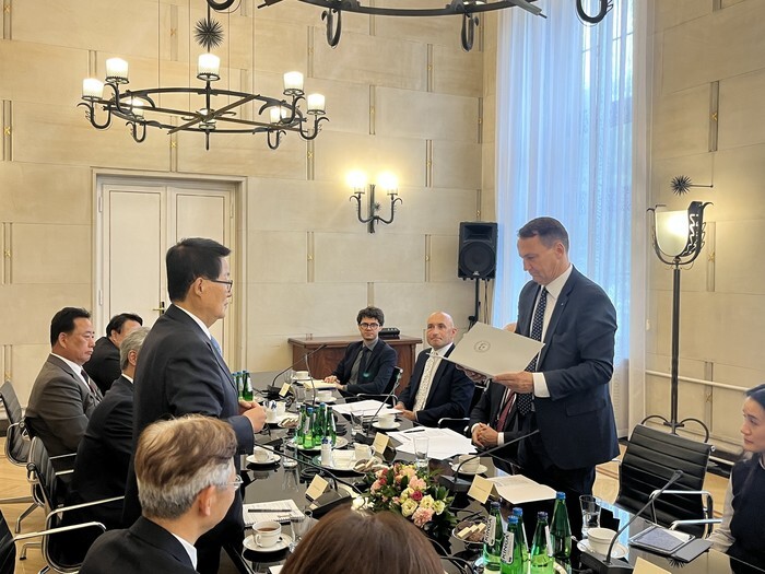 Park Jie-won (L, standing), a special envoy of South Korean President Lee Jae Myung, presents Polish Foreign Minister Radoslaw Sikorski (R, standing) with a personal letter from Lee during their meeting in Warsaw on July 29, 2025, in this photo released by the South Korean foreign ministry. (PHOTO NOT FOR SALE) (Yonhap)