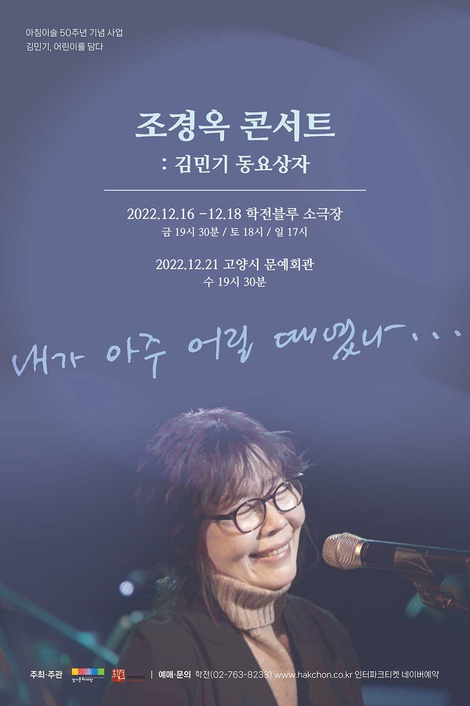이번 콘서트는 경기문화재단 주최·주관으로 마련됐다. 조경옥은 김민기의 동요 음반 '김민기, 어린이를 담다' 수록곡을 중심으로 다양한 노래를 들려준다.