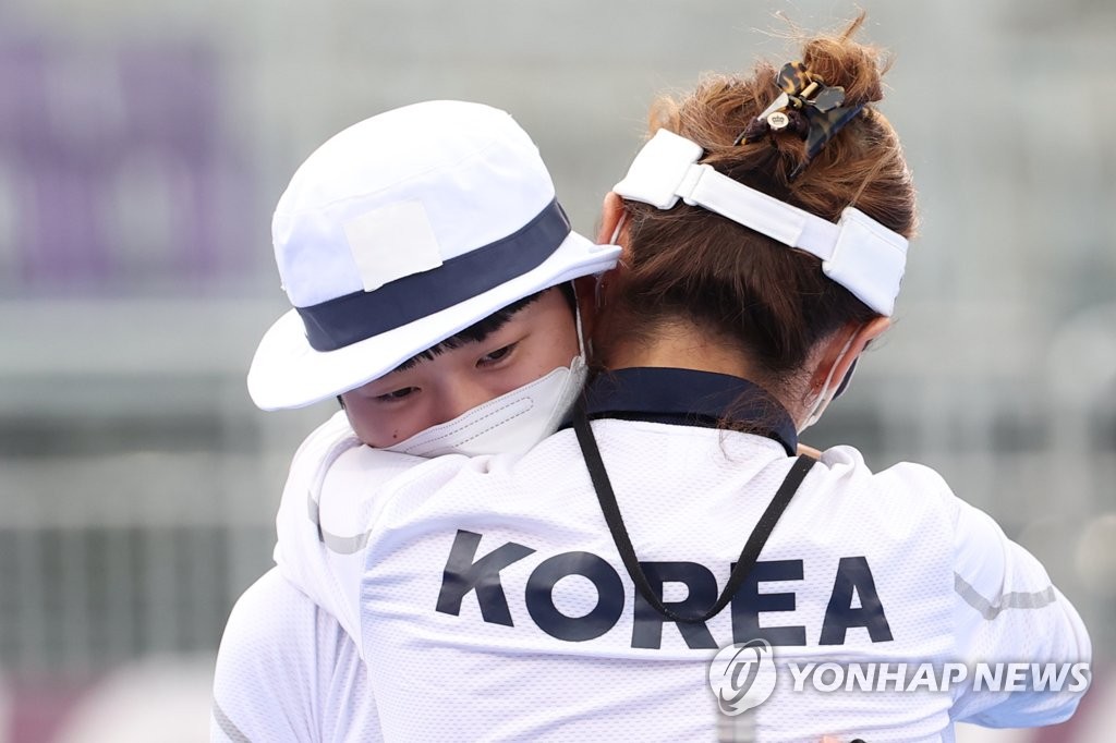 | ▲ An San of South Korea (L) embraces her coach Ryu Su-jeong after winning the gold medal in the women's individual archery event at the Tokyo Olympics at Yumenoshima Park Archery Field in Tokyo on July 30, 2021. (Yonhap) |