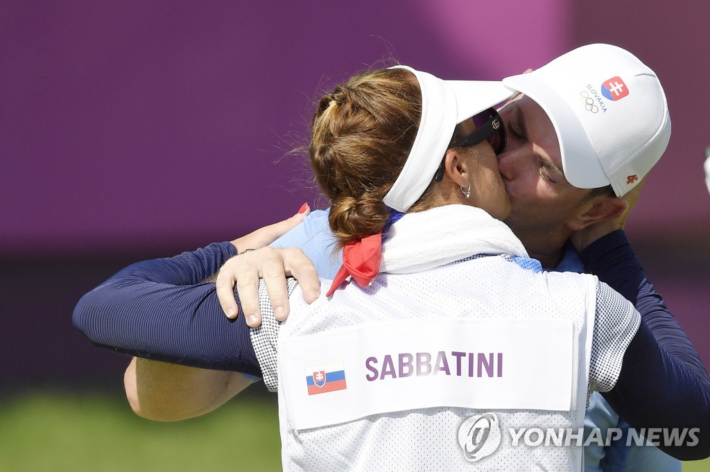 | ▲ 사바티니가 은메달 획득 뒤 캐디를 맡은 아내와 키스하고 있다. [로이터=연합뉴스] |