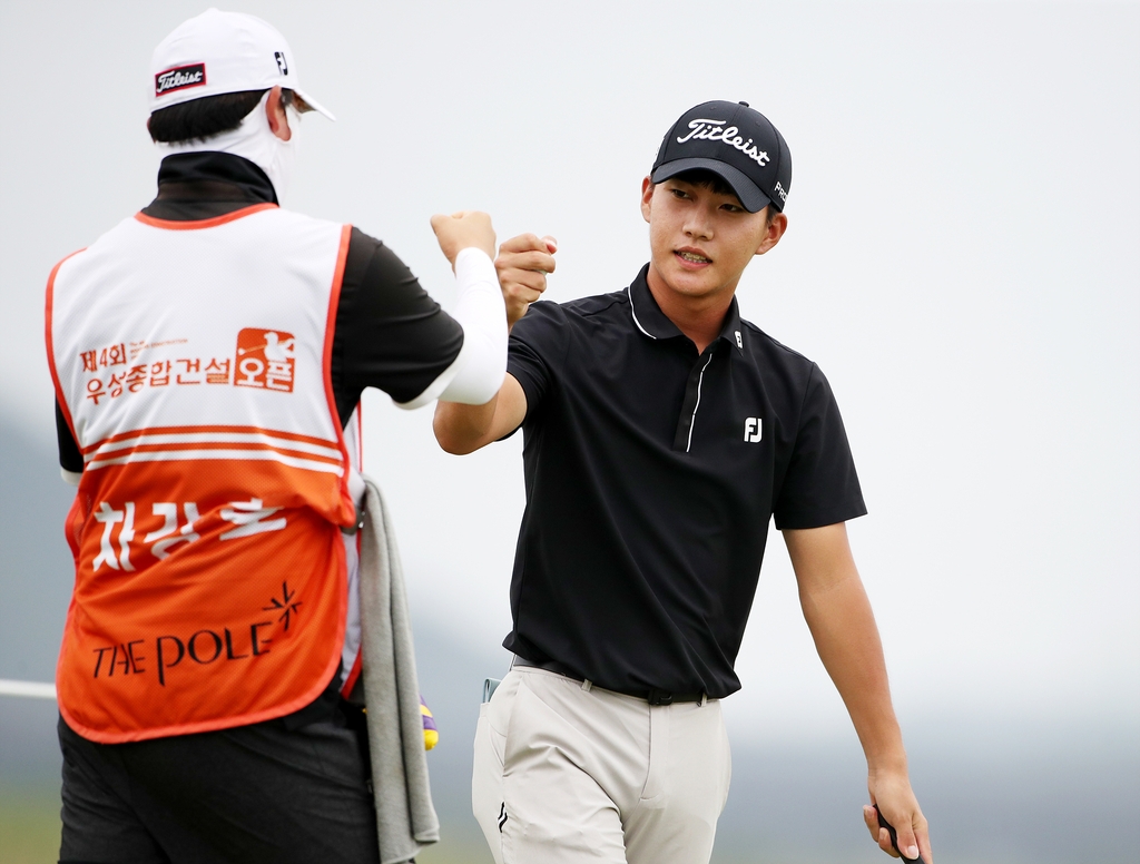 | ▲ 버디를 잡아내고 캐디와 주먹을 마주치는 차강호. [KPGA 제공. 재판매 및 DB 금지] |
