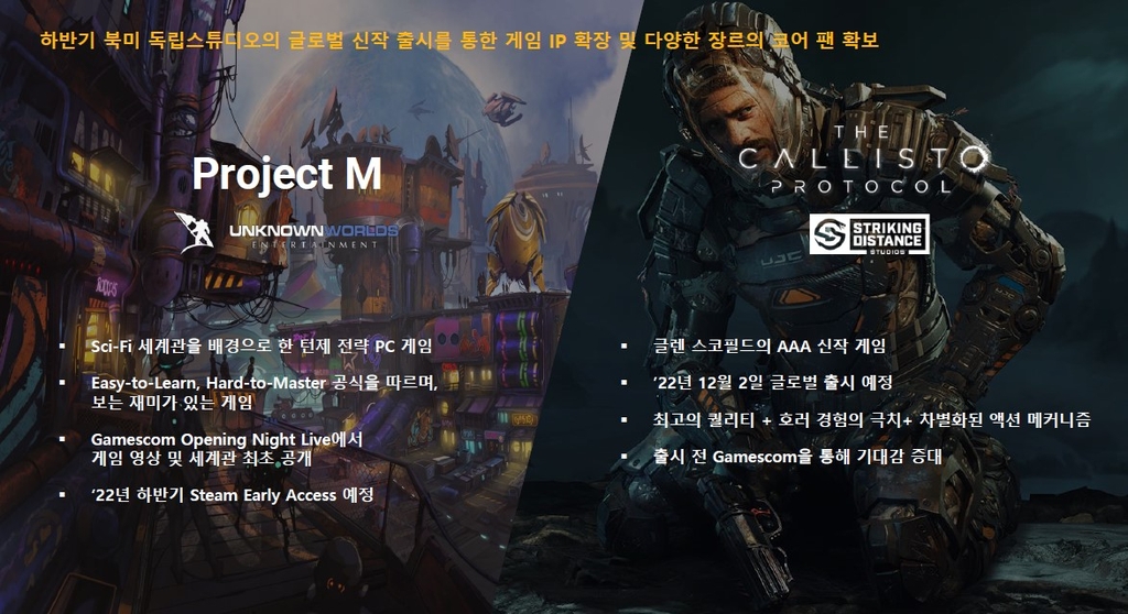 크래프톤은 하반기 신작 게임 개발에 집중한다. 이달 23∼28일 독일 쾰른에서 열리는 유럽 최대 게임쇼 '게임스컴 2022'에서 12월 출시 예정인 칼리스토 프로토콜(TCP)과 프로젝트M 등 신작 게임의 미공개 영상을 공개하고, 게임 시연에도 나선다.