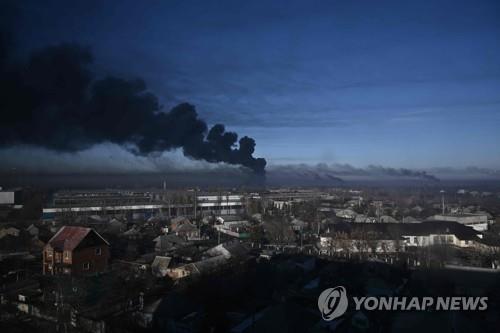| ▲ This AFP photo issued on Feb. 24, 2022, shows black smoke rising from a military airport in Chuguyev, near Kharkiv, in Ukraine. (PHOTO NOT FOR SALE) (Yonhap) |