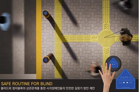 대상은 시각장애인들이 안전하게 길을 찾도록 돕는 '세이프 루틴 포 블라인드'(SAFE ROUTINE FOR BLIND·수상자 오수미, 김수민)가 차지했다. '팔각 점자형 보도블록'과 '점자형 촉지 스티커'를 고안해 시각장애인들의 보행을 돕는 아이디어다.