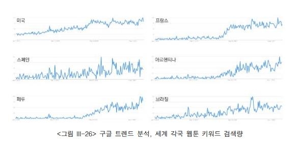 지난해 말 제출된 외교부 용역보고서 '빅데이터에 기반한 해외 대중의 한국문화 콘텐츠 선호도 분석 및 공공문화외교 정책에 대한 함의 도출'에 따르면 2018년 초 대비 약 3년 만에 세계 각국에서 '웹툰'이라는 키워드 검색량이 꾸준히 늘고 있다.