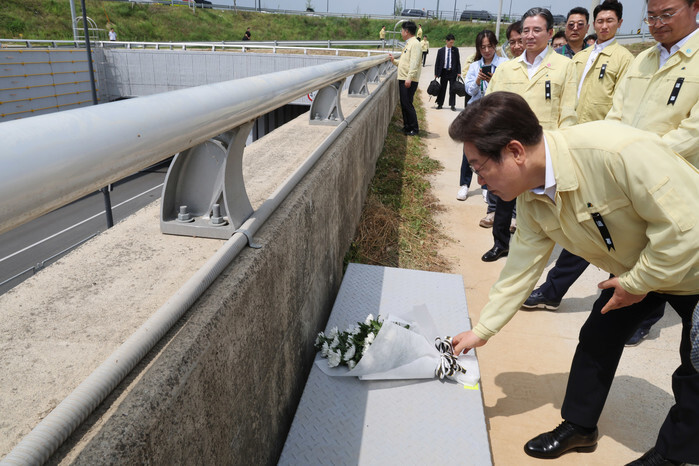 President Lee Jae Myung places a flower at an underground roadway in the town of Osong in Cheongju, central South Korea, on July 14, 2025, to pay tribute to 14 people who were killed in the flood-hit tunnel following the overflowing of a nearby river triggered by torrential rain on July 15, 2023. (Pool photo) (Yonhap)